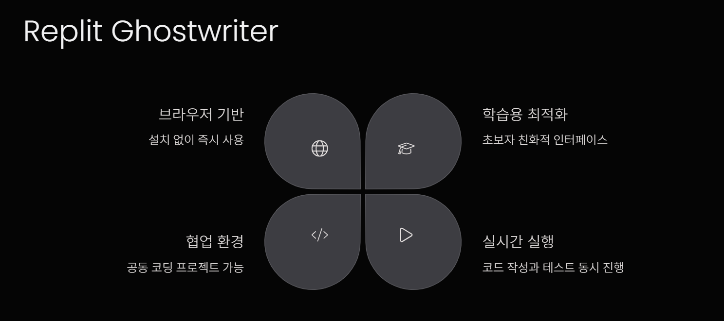Replit은 클라우드 기반 개발 환경으로, Ghostwriter는 그 내부에 포함된 AI 코딩 도우미입니다. 웹 브라우저에서 바로 사용할 수 있으며, 즉시 실행 가능한 코드 환경을 제공합니다.