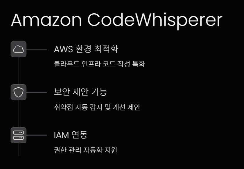 AWS에서 개발한 AI 코드 어시스턴트입니다. 특히 클라우드 인프라와 연계된 코드를 작성할 때 강점을 가집니다. IAM 연동, 보안 분석 기능도 포함되어 있습니다.