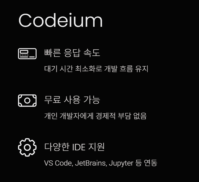 Codeium은 무료로 제공되는 AI 코딩 보조 도구입니다. VS Code, JetBrains, Jupyter 등 다양한 IDE에 플러그인으로 연동할 수 있습니다.